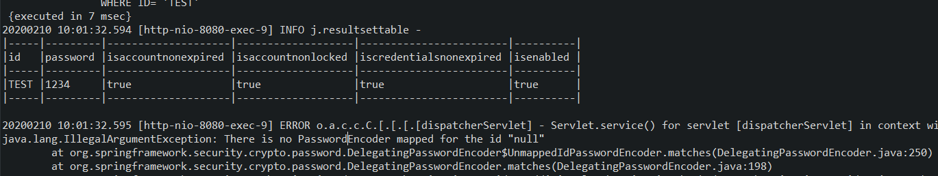 이번에는 에러메시지가 화면에 출력되지않았는데, 콘솔창에 아래와같이java.lang.IllegalArgumentException: There is no PasswordEncoder mapped for the id "null" ERROR가 발생하였다.