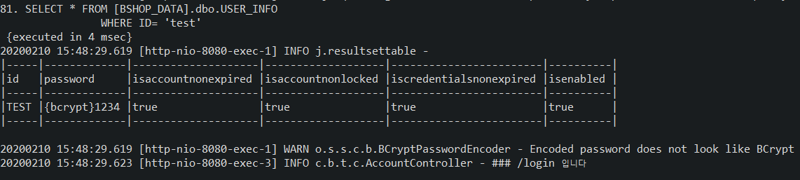 SpringSecurity를 적용하기위해서, 계정테이블에 ID : TEST, PW : 1234의 데이터를 직접 INSERT하였다.