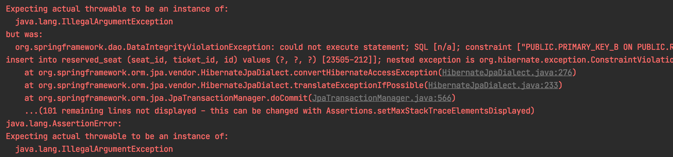 - 현재 프로젝트에서 동시에 같은 좌석이 예약되는 경우 DataIntegrityViolationException이 발생한다