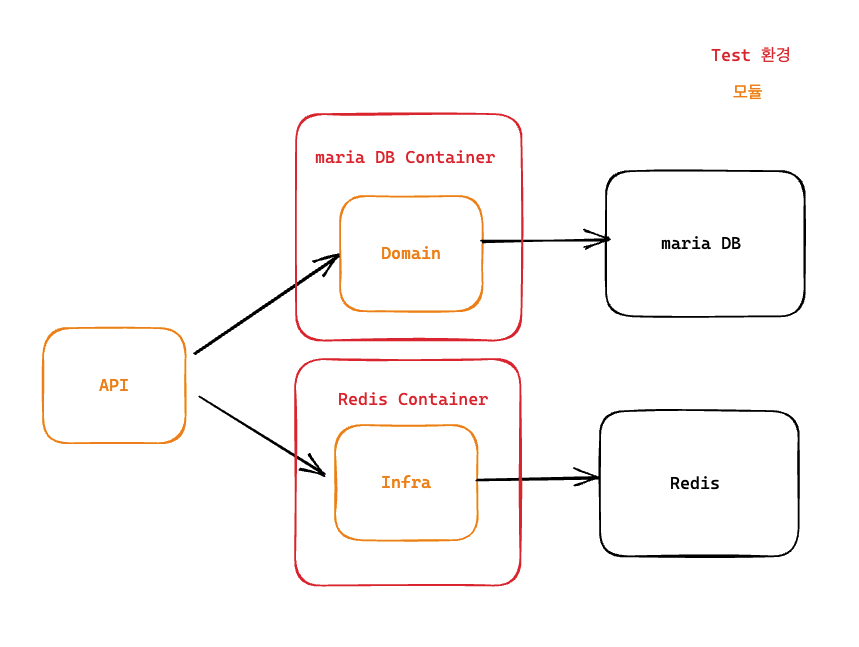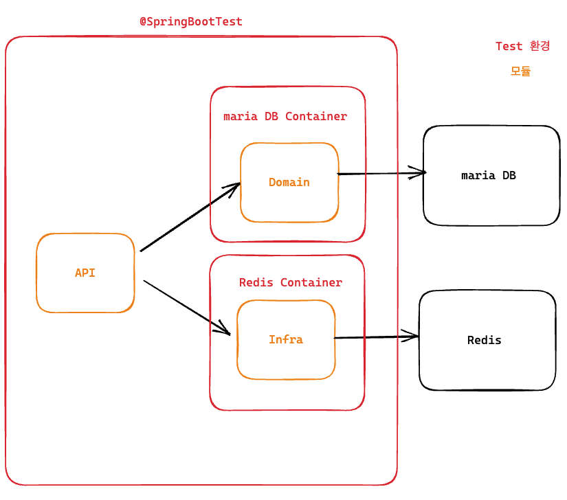 현재 프로젝트 구조는 위와 같다. Domain 모듈에서 Repository 계층을 책임지고 있기 때문에, 해당 단위테스트는 mariaDB Container를 사용해 해결했다. Infra 모듈에서 역시 Redis 컨테이너를 통해 단위테스트를 진행할 수 있을 것이다. 그럼 통합 테스트 환경은 어떻게 구성하는 것이 좋을까??