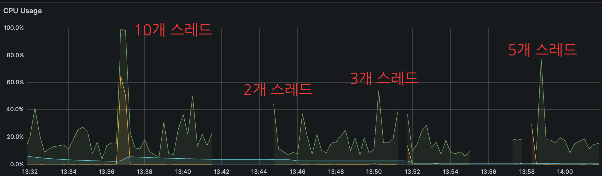 반면 5개 스레드로 처리할 때는 80% 정도기 때문에 10개와 비교하여 20% 정도의 여유를 가질 수 있다.
